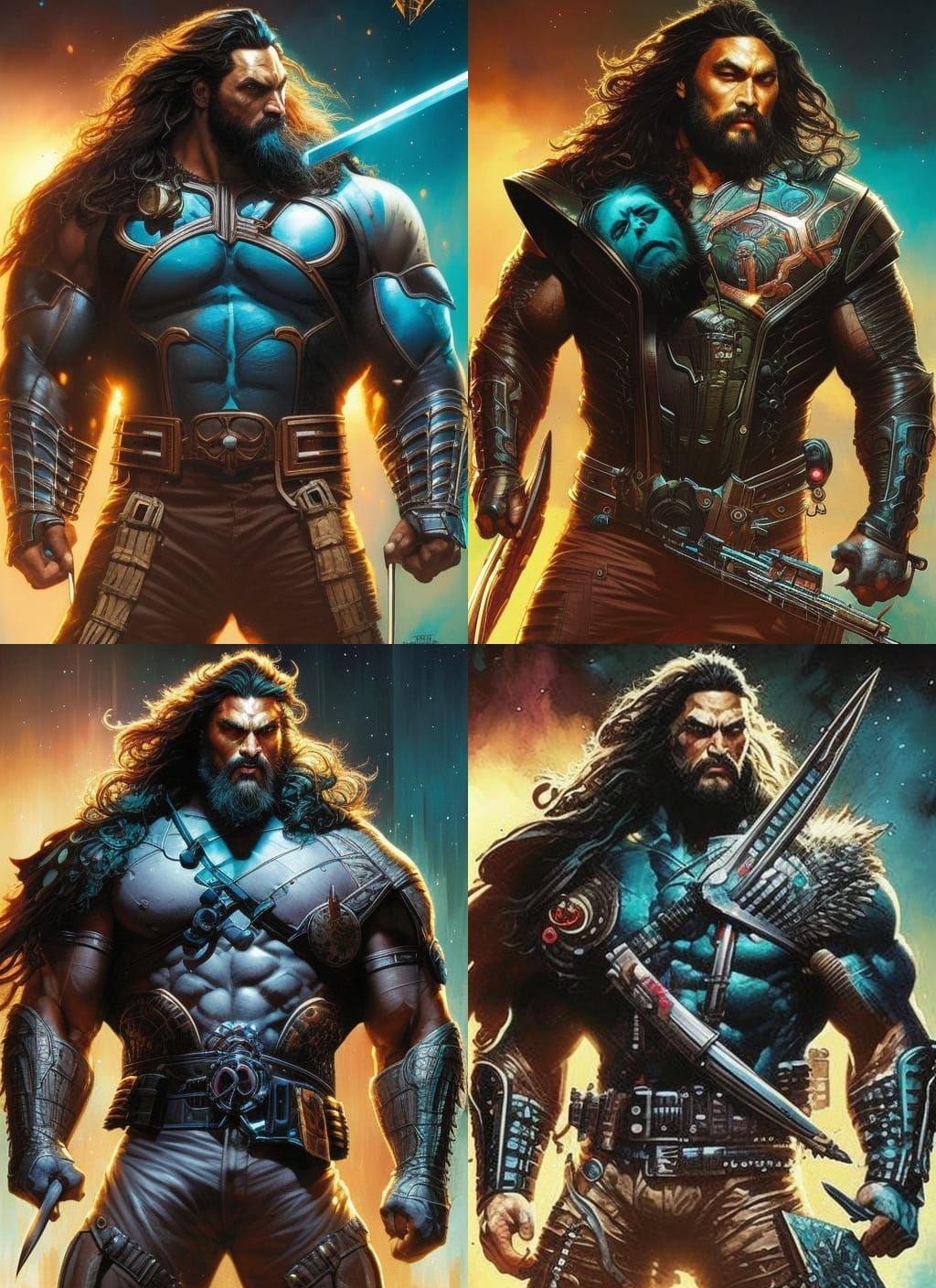A vibrant crayon caricature of Jason Momoa as Lobo. The image features a whimsical background and is reminiscent of comic book art with vivid colors and hyperrealistic detail.