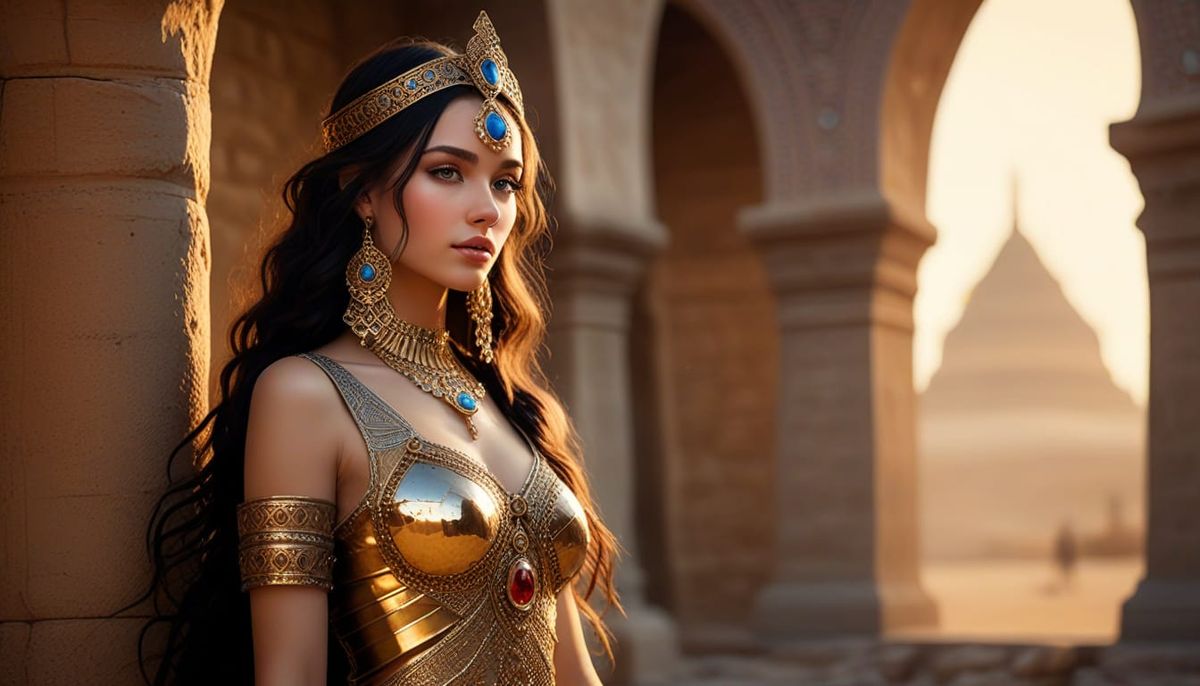 This image shows a beautiful jeweled Berber Princess in a Moroccan bazaar, inspired by medieval fantasy art with ink and watercolor wash.