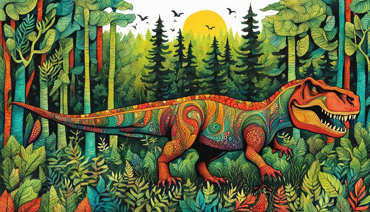 This image shows a vibrant and intricate ink illustration of a cheerful Tyrannosaurus Rex amidst a dense forest, created with asemic and zentangle-inspired patterns.