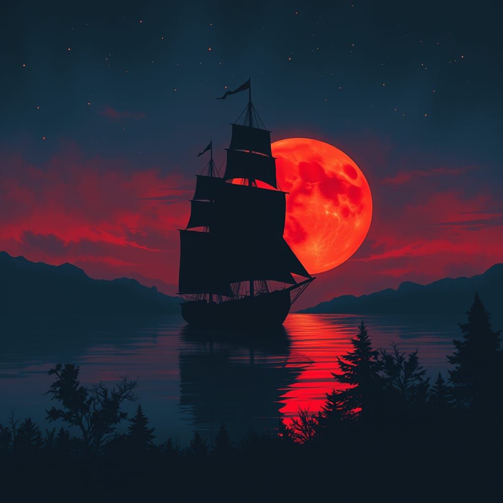 A striking picture of a silhouetted ship sailing under a blood-red moon. Reflected fiery hues and shadowy trees create a dreamlike, eerie atmosphere in a semi-realistic style.