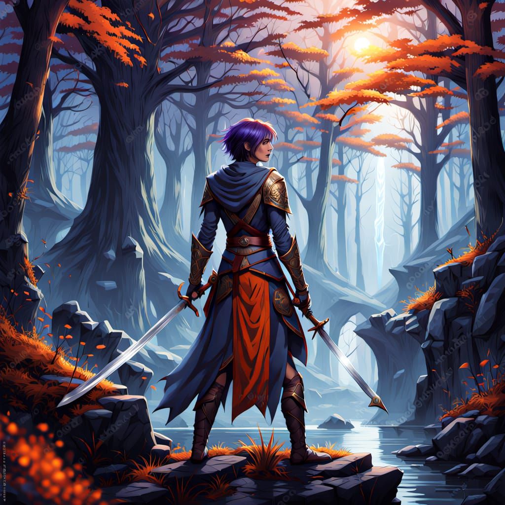This image shows a heroic androgynous figure wielding three swords in a mystical forest setting, surrounded by warm golden light and deep blues, with intricate details and subtle gradient effects.