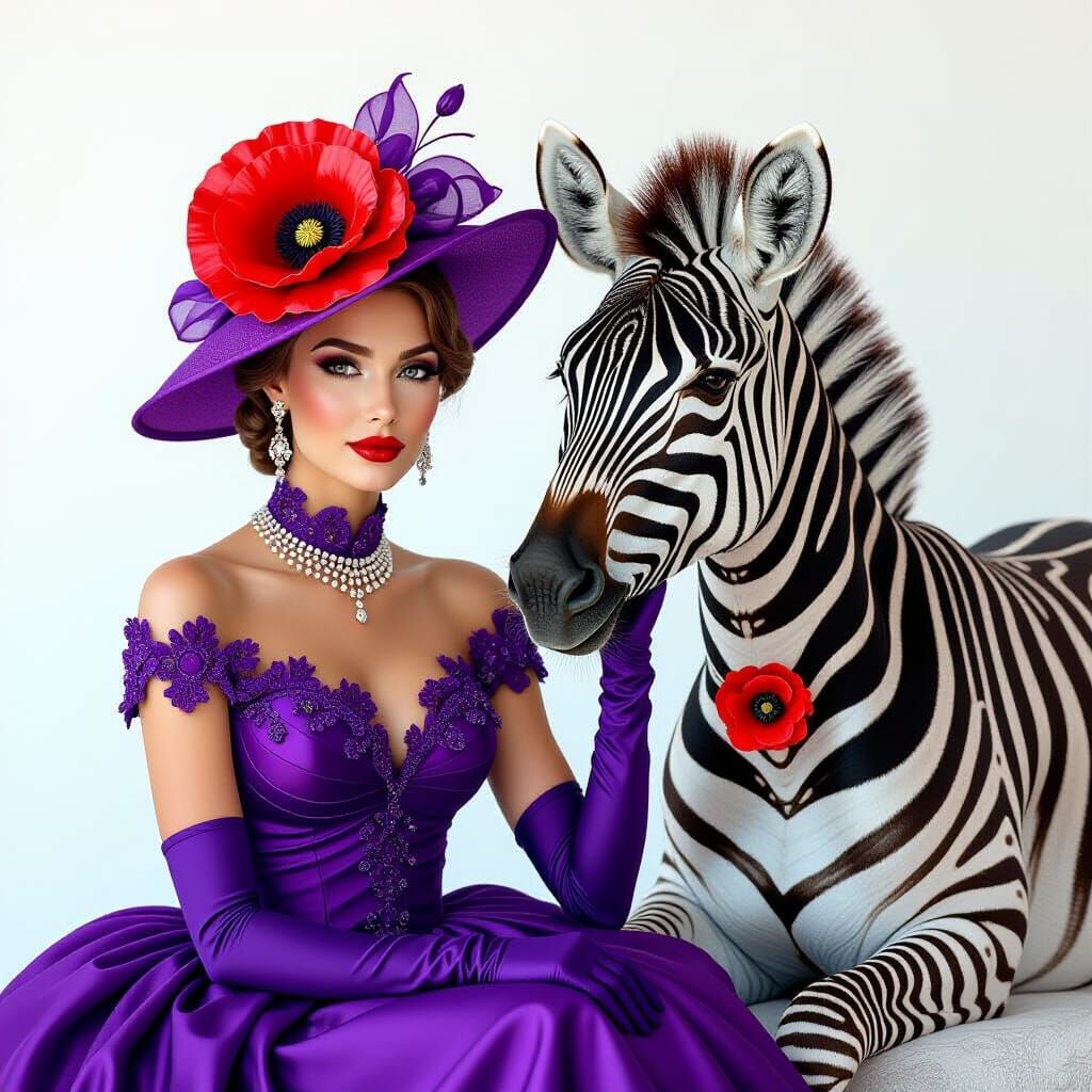 An ultra-realistic pencil sketch featuring a woman in a stunning purple dress adorned with intricate details. Her hat is a beautiful poppy flower shape, and she wears purple gloves that complement her outfit. Sitting gracefully beside her is an elegantly presented zebra lying down, also adorned with ...