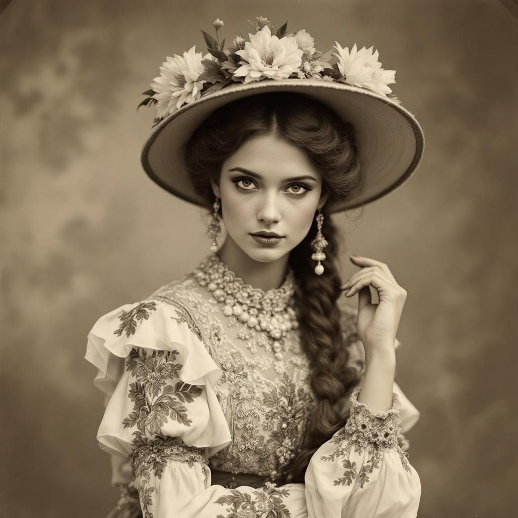 This image shows a stunning young woman in Edwardian-era attire, richly embroidered clothing, and a floral hat. The portrait is reminiscent of vintage daguerreotypes, with sepia and duotone tones.