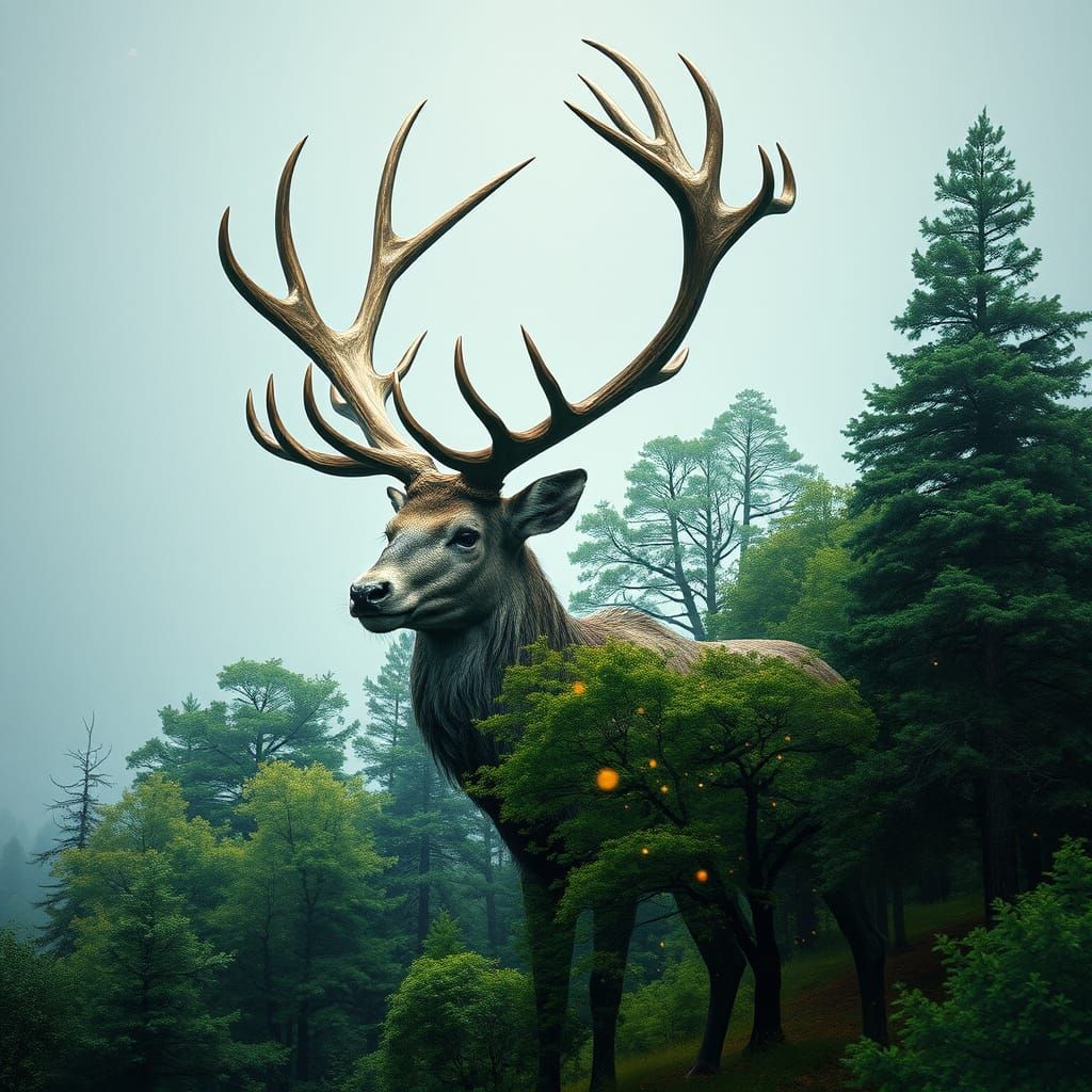 A captivating image of a stag merged with a forest in double exposure. Fireflies illuminate the scene, rendered as a detailed matte painting with complementary colors and intricate details. Fantasy concept art.