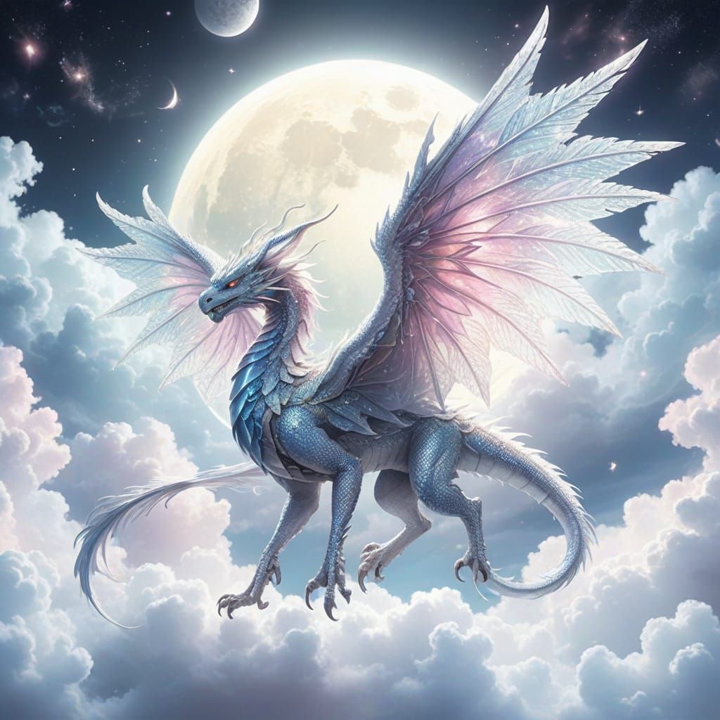 This image shows a celestial silver dragon-griffon hybrid with delicate, laced wings and an elegant form. The creature is set against a backdrop of pastel clouds and moonlit sky, rendered in an anime style.