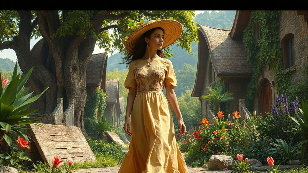 This image shows a woman in an embroidered dress walking through a solarpunk settlement. The scene features lush greenery, vibrant flowers, Art Nouveau architecture, and sustainable technology.