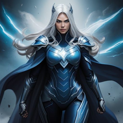 This image shows a powerful female superhero, 'M', in gleaming sci-fi armor. The dynamic illustration features a determined gaze and billowing cape, rendered in electric blue and silver.