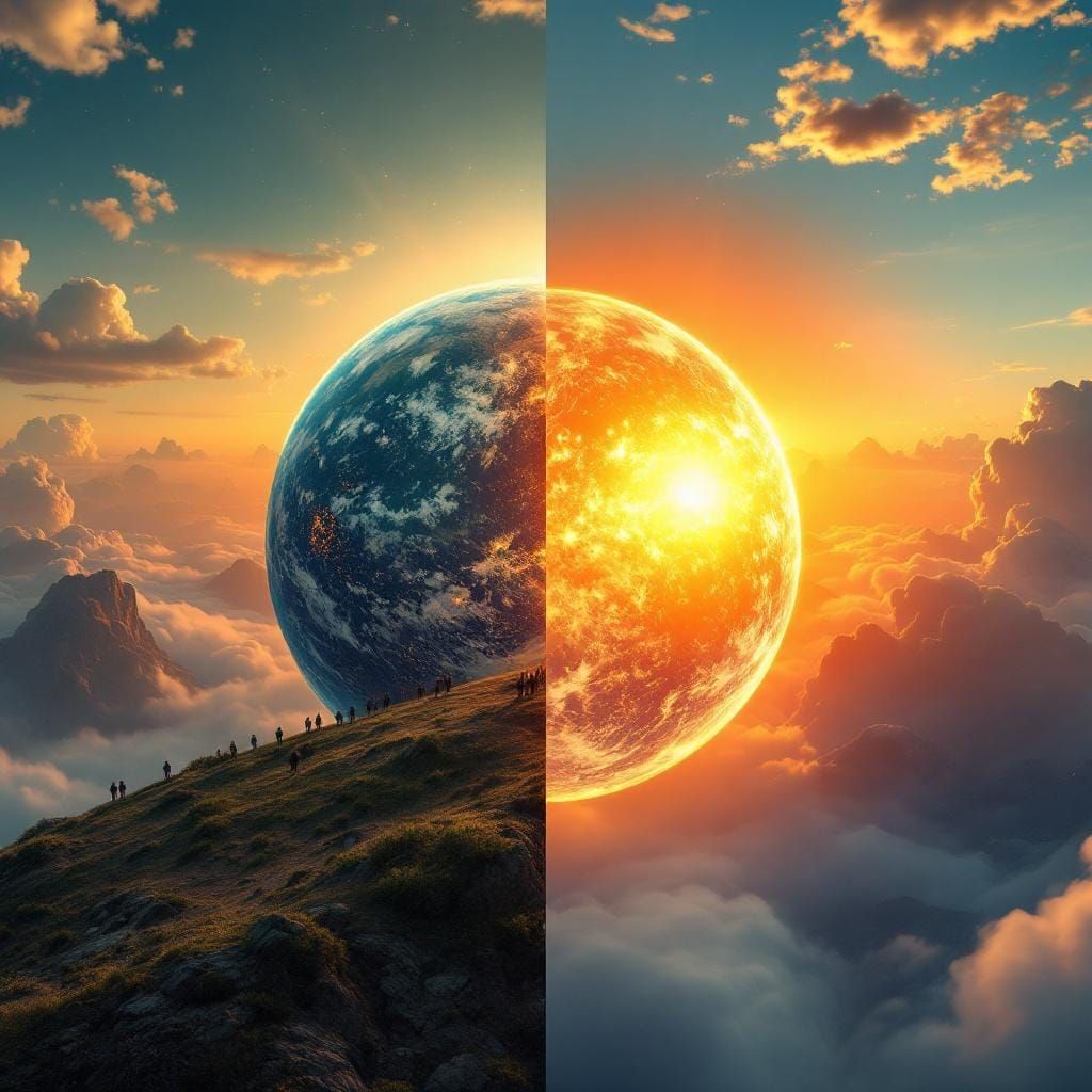 This image shows a divided Earth, one side populated with people and the other illuminated by a radiant sun. The image has a photorealistic style.
