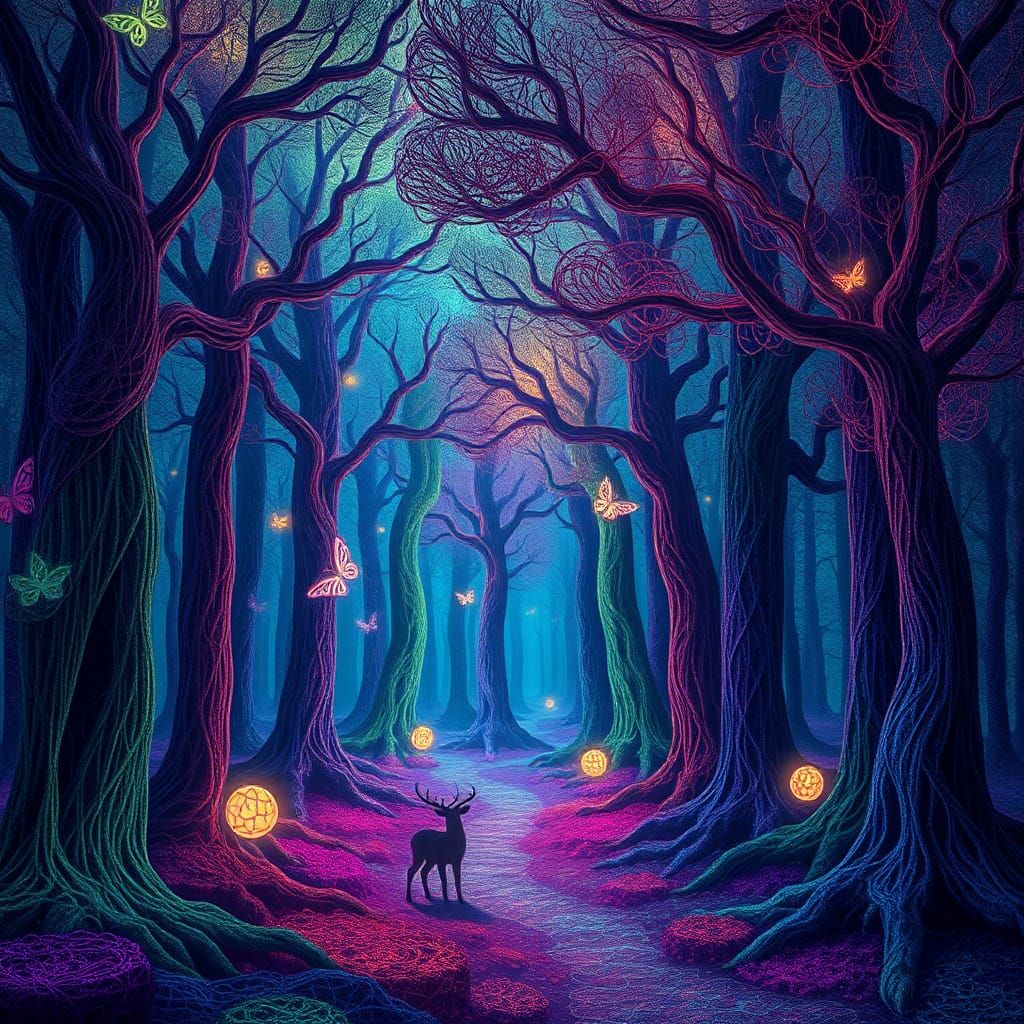 A captivating image of a glowing, mystical forest. The scene features towering trees with elaborate, swirling trunks and fiber-optic-like leaves. The forest floor displays Celtic knot patterns in a dreamlike aesthetic.