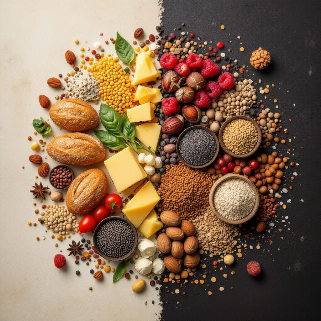 A striking picture of an apple split in half, contrasting processed foods with natural produce. Organic textures and soft tones blend with labels and packaging in a cinematic style.