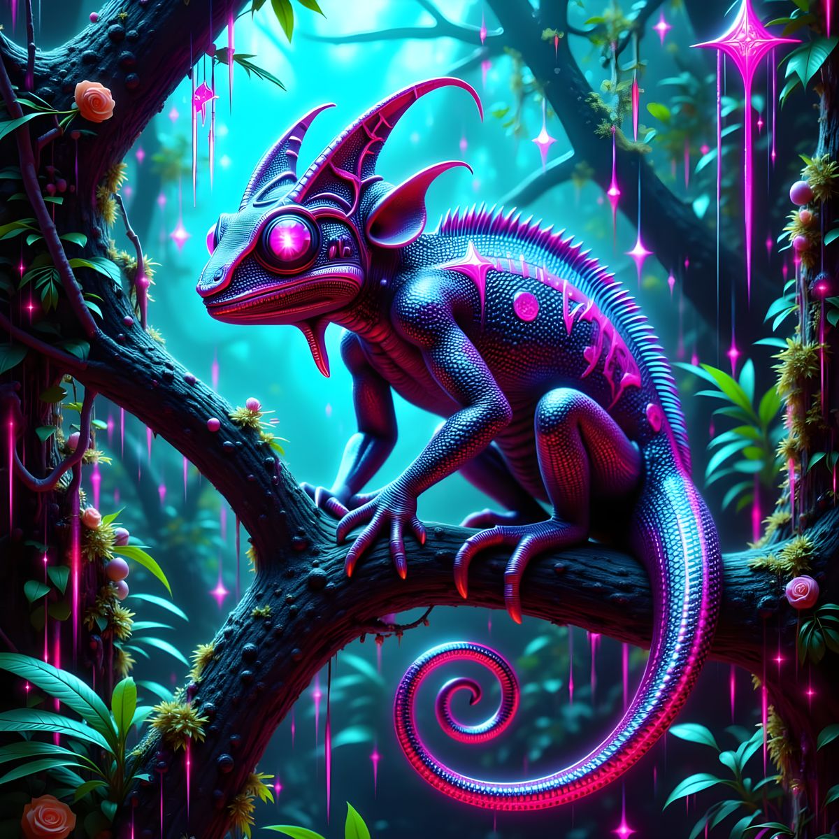 An oil painting of a majestic chameleon with metallic scales and glowing eyes in an alien jungle. Features a glitch effect, dark fantasy, and neon-futuristic elements.