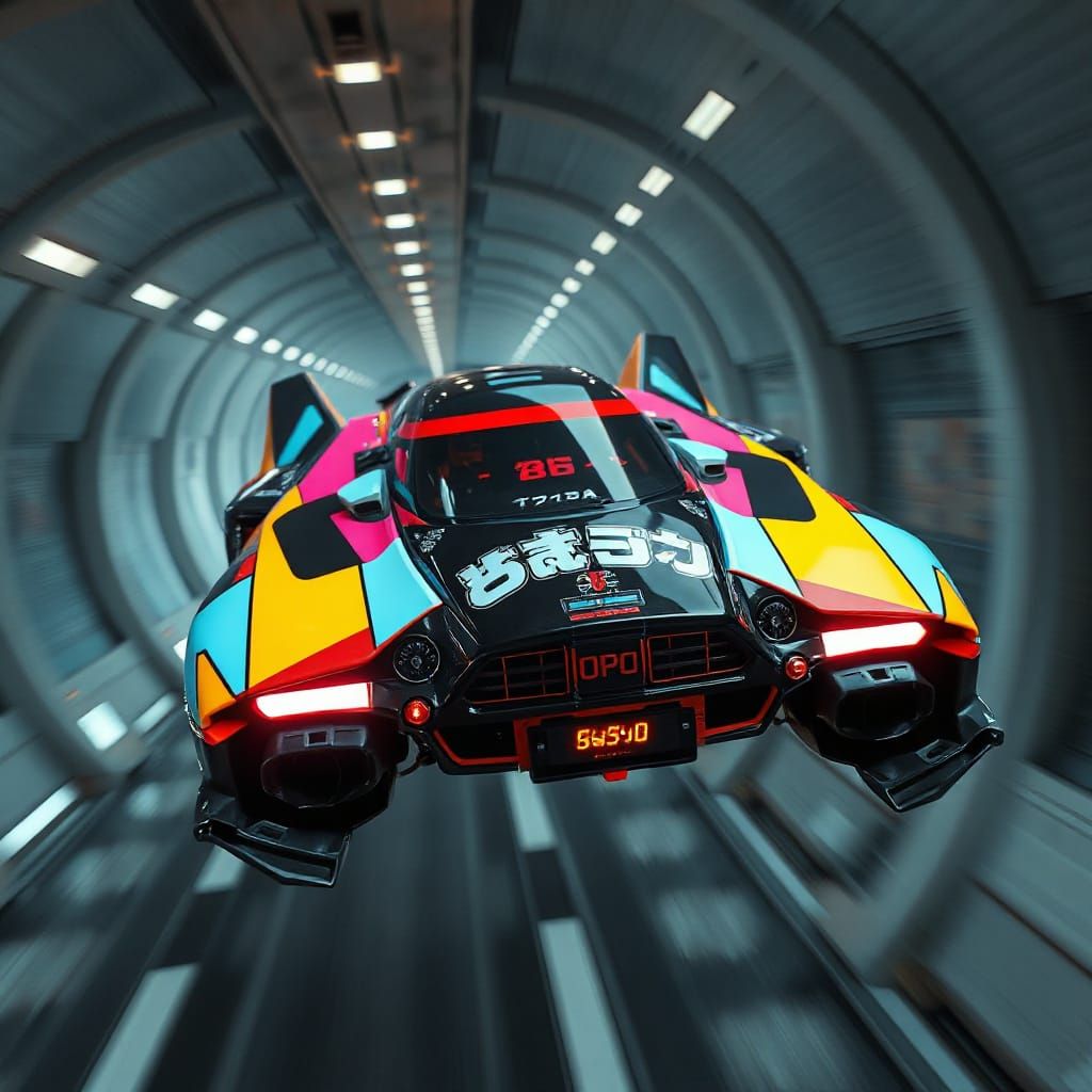 photo photorealistic photographic realism aerial 3D angled photo of a far future flying floating soaring cyber tech sport hover-speeder with huge sporty future logos with chunky Japanese lettering with rounded edges. aerodynamicly designed plastic multicolour and black colour block sections with forward ...