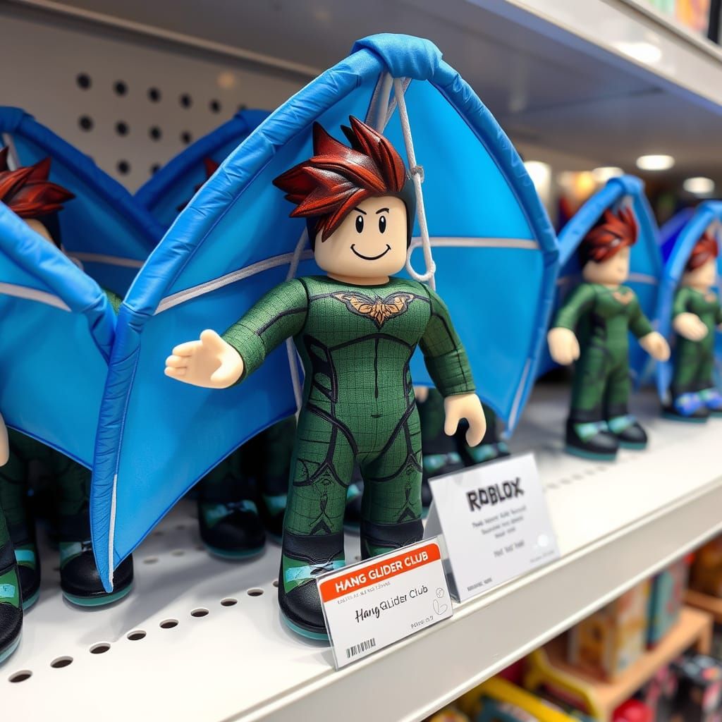 This image shows a Roblox-style plush hang glider doll on a store shelf. The doll wears a dark green bodysuit and holds a blue and white hang glider. A sales tag sits in front of the display, rendered with vivid colors.