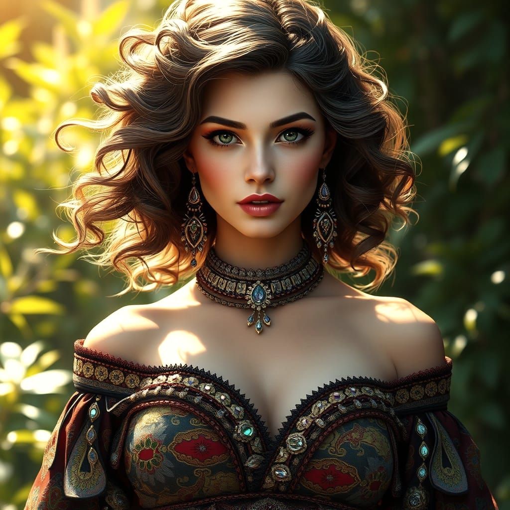 This image shows a beautiful woman with expressive eyes, adorned with jewelry. She wears colorful, ornate garments in a natural, sunlit setting, rendered with dynamic lighting and intricate detail.