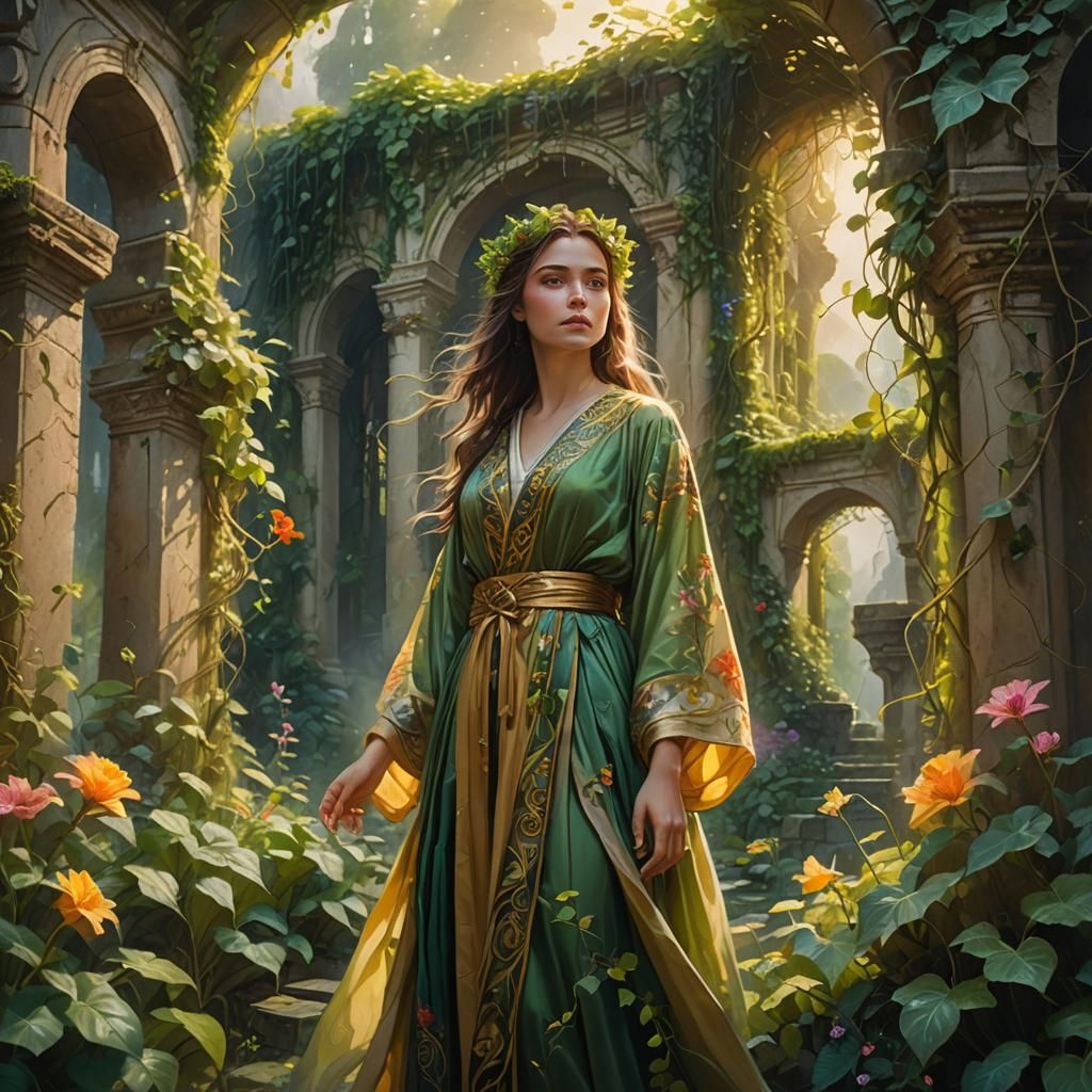 A vibrant oil painting of a woman in an enchanted garden filled with lush greenery and ancient stone structures. The scene is bathed in soft golden light with intricate details, textures, and a mythical atmosphere.