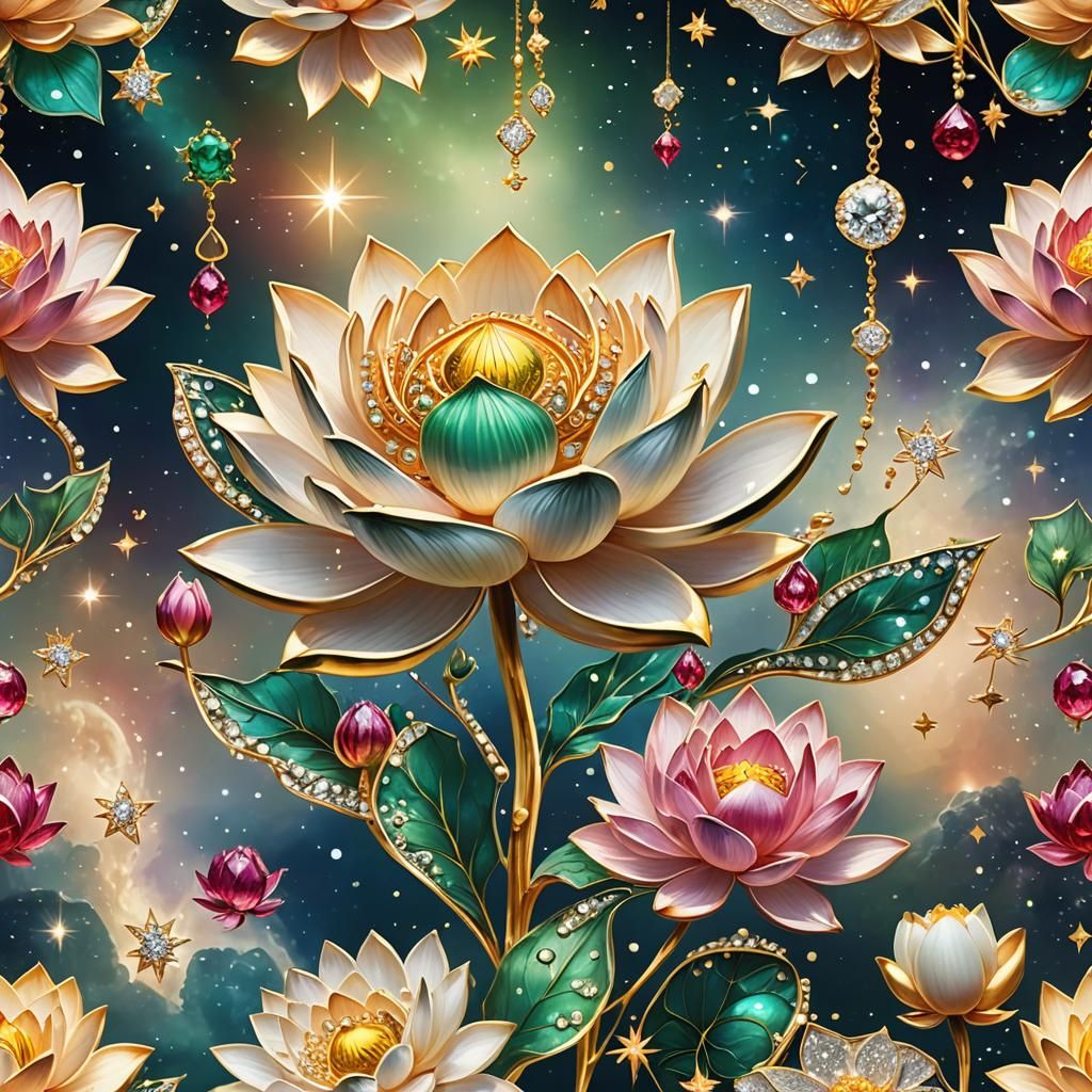 A digital illustration showcasing a large, ornate gold lotus flower jewelry piece adorned with pearls, diamonds, rubies, and emeralds. The backdrop features a vibrant spacescape filled with sparkling stars and galaxies.