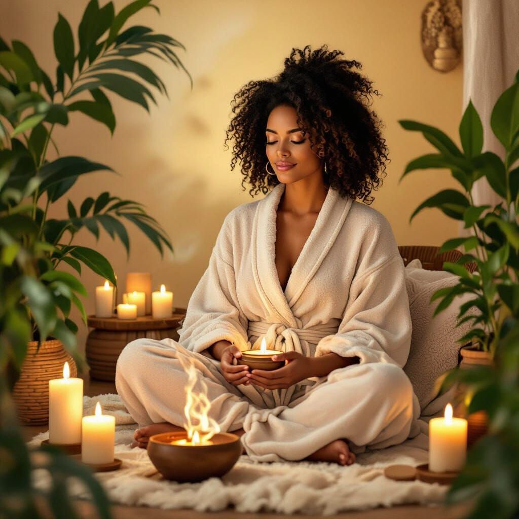 This image shows a black woman enjoying a yoni steam. She's wrapped in a robe, surrounded by candles and plants, in a warm, earthy style. The image has a painterly quality.