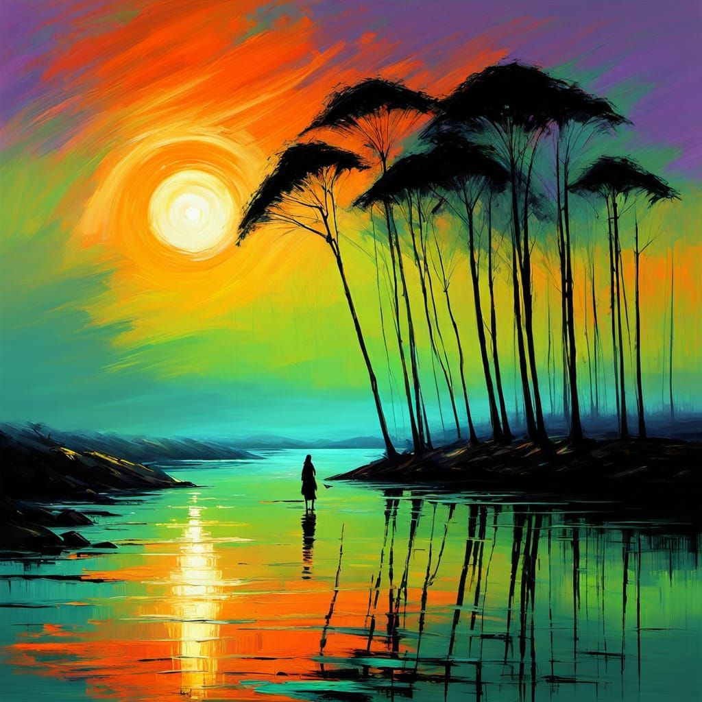 by Josh Adamski, Tachisme dynamic brushwork, rough strokes, Debra Hurd summer melancholy hazy pale beautiful shades of neon green and neon orange, precise line art. magical. mystical. dreamlike quality pastel colours, William Waterhouse