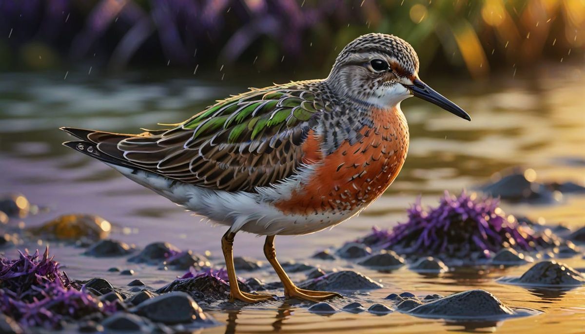 A striking picture of a red knot sandpiper in vibrant plumage. The image features intricate feather detail, a soft colorful background, and golden side lighting, rendered with hyperrealism.