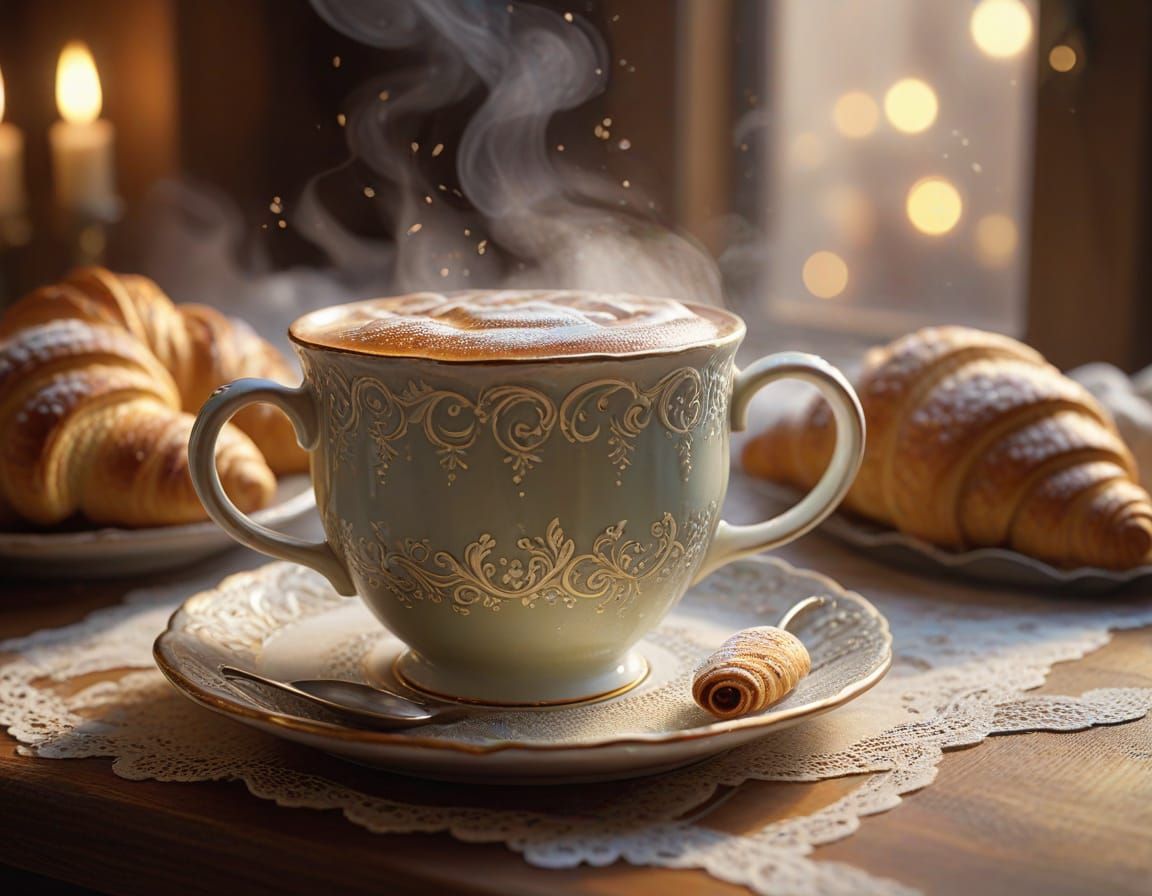 A warm and inviting image of a steaming cup of hot chocolate and flaky croissants on a delicate table, surrounded by a soft, misty atmosphere and golden lighting.