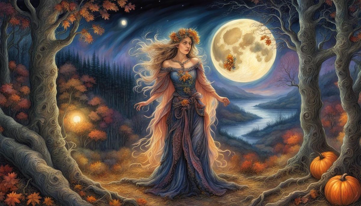 This image depicts a dark morris dance hidden in the woods at night, celebrating autumn under a full moon. The artwork is rendered in a comic book fantasy style.