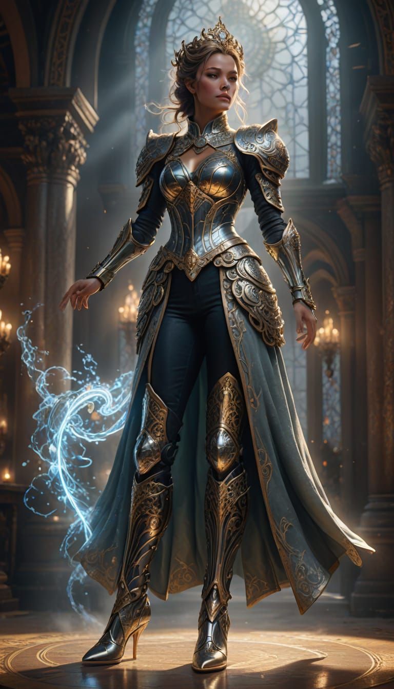 This fantasy illustration depicts a regal woman in a divine pose, wearing ornate, gravity-defying boots. Glowing energy and swirling mist surround her, enhanced by dramatic lighting.