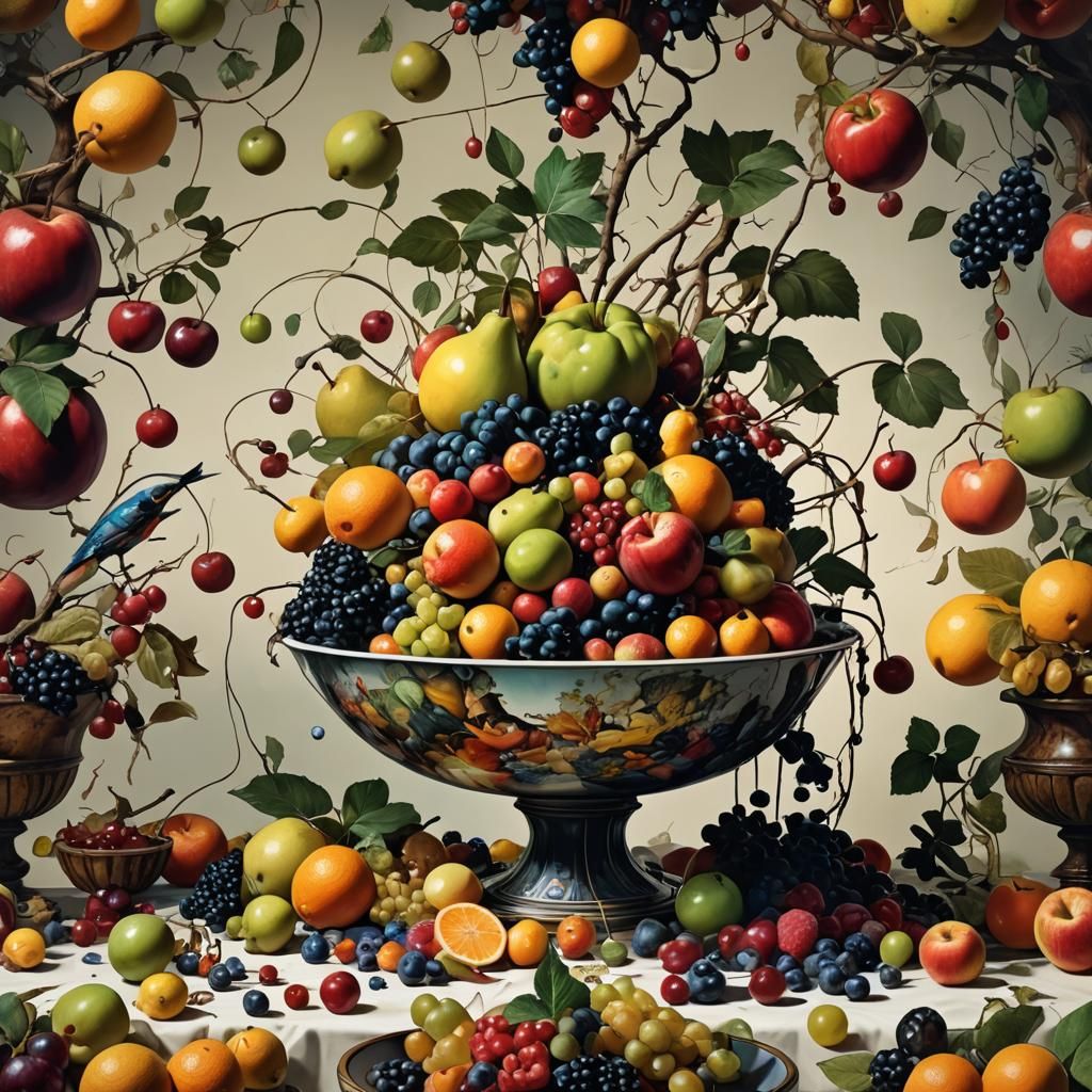 A vibrant still life of a fruit bowl against a surreal backdrop. The artwork showcases hyperrealistic details, dramatic lighting, and a colorful aesthetic, reminiscent of splash art.
