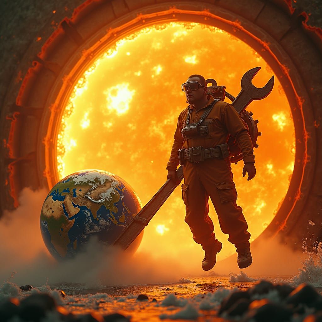 This image shows a mechanic repairing clockwork inside the sun. The Earth is overheating in the foreground. This cinematic, photo-realistic image features film grain, a vignette, and high contrast, reminiscent of classic sci-fi epics.
