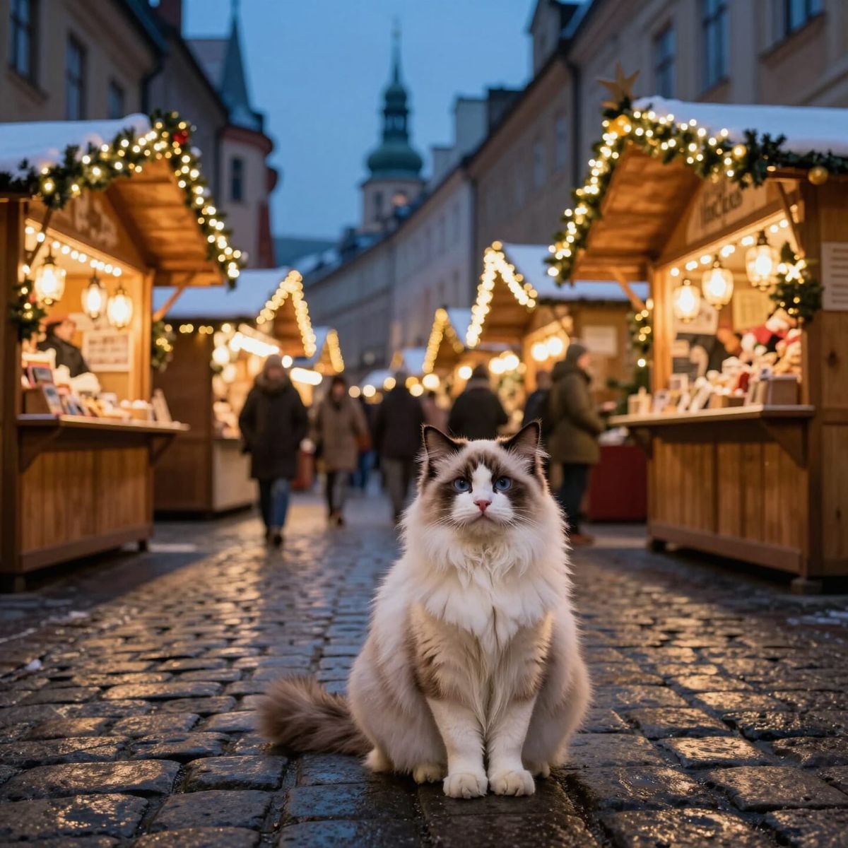 This image shows a fluffy Ragdoll cat in a vibrant European Christmas market at twilight. Soft snow falls, creating a photorealistic scene with atmospheric bokeh and warm light.