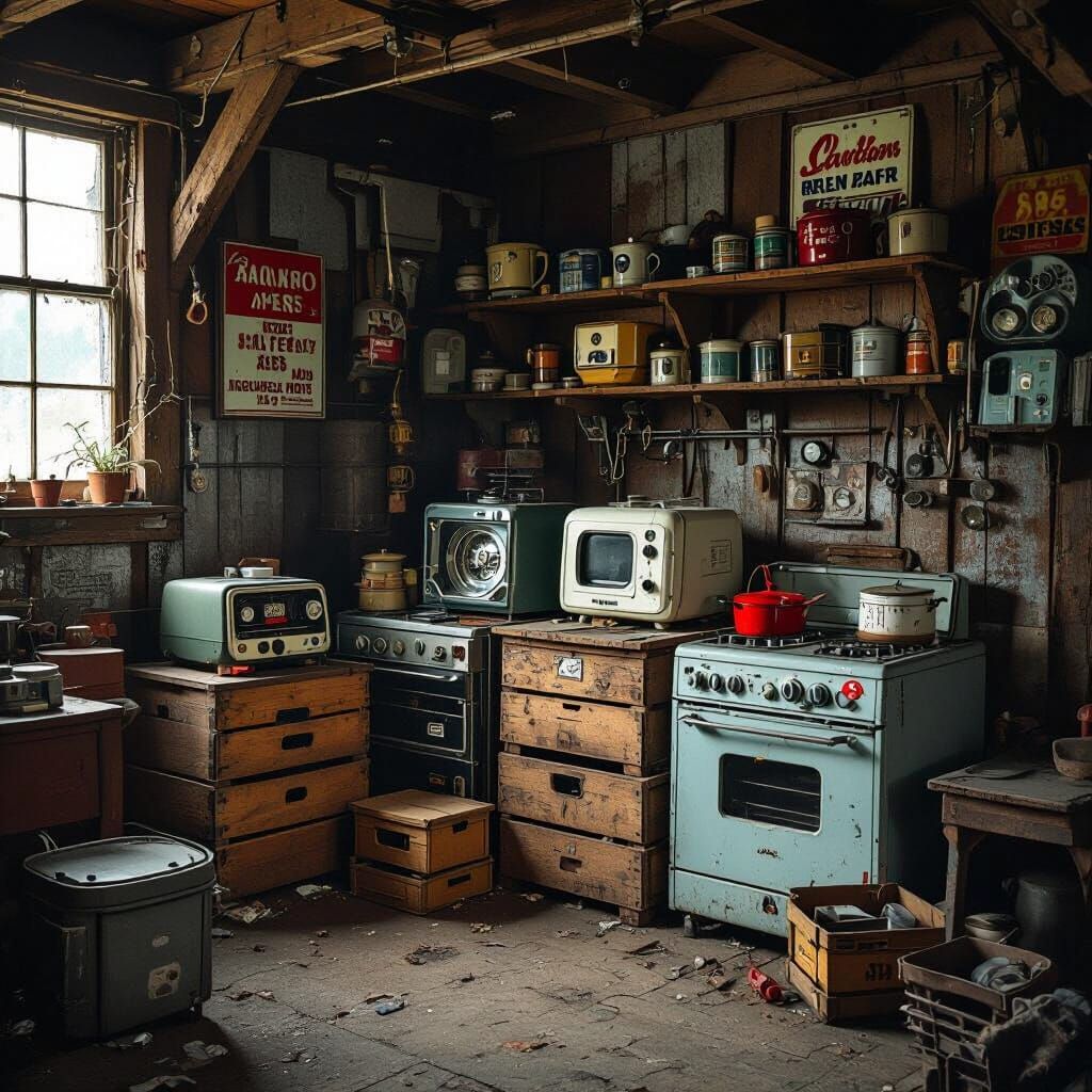 This image shows vintage electric gadgets and kitchenware filling a cluttered, dimly lit garage. The image evokes a retro-futuristic aesthetic with worn crates, rusty tools, and faded ads.