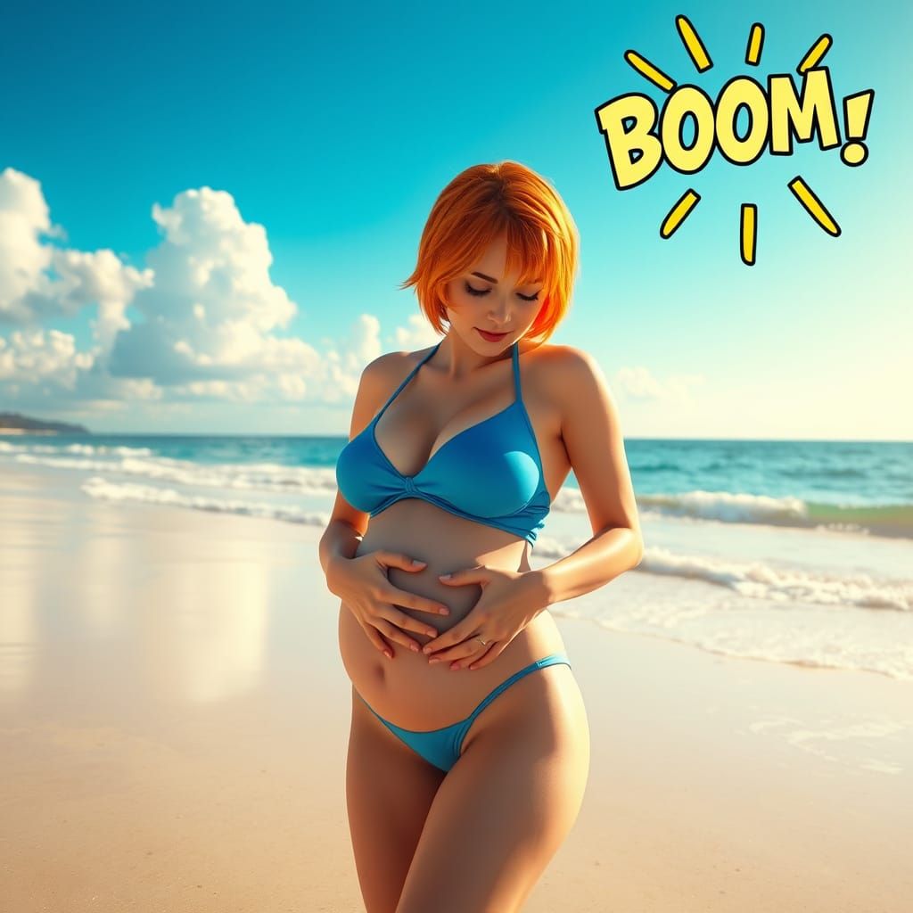 This image shows a pregnant woman with bright orange hair on a sunny beach. She is wearing a blue swimsuit and feeling her baby kick, rendered with cel-shaded depth and vibrant colors in a manga style.