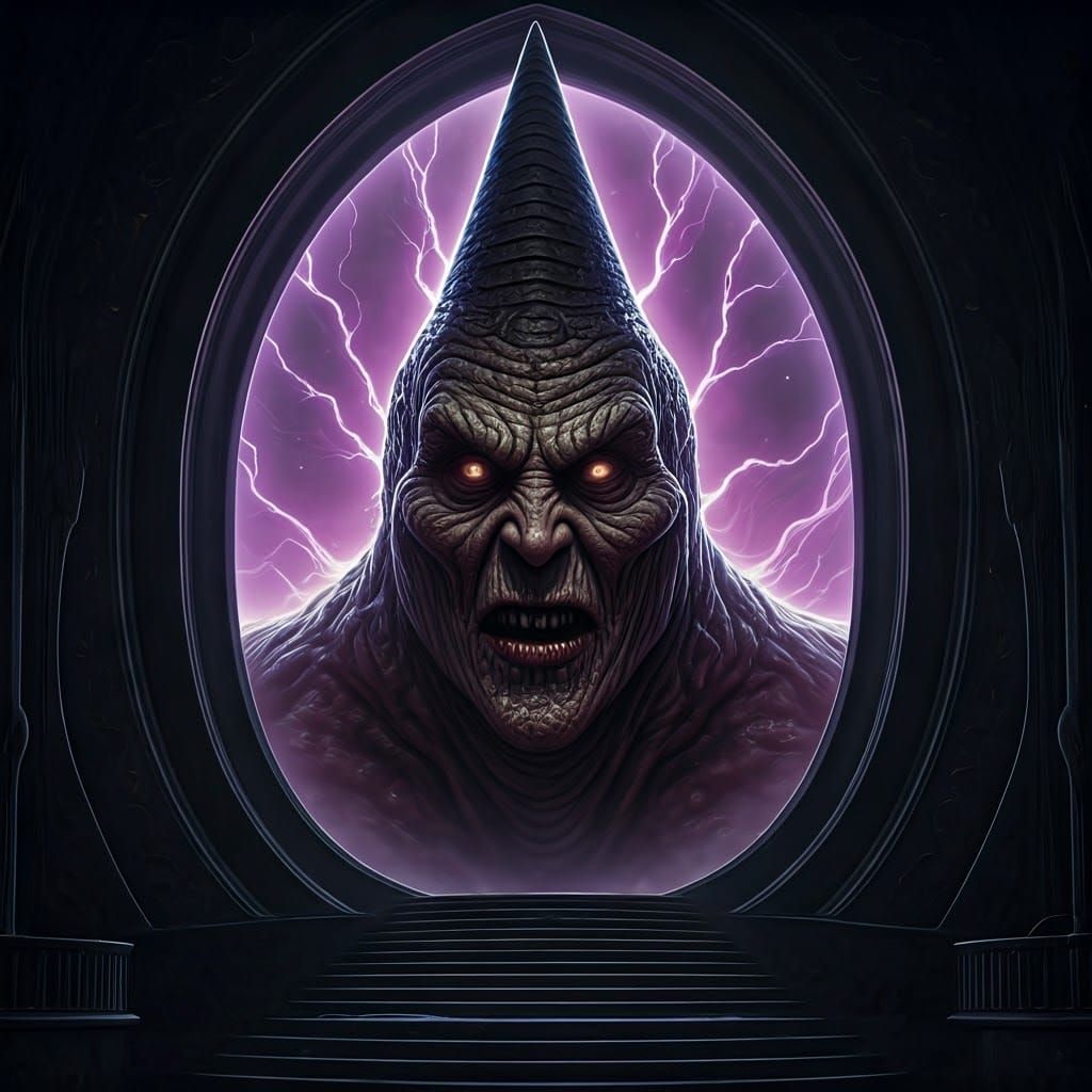 This image depicts a terrifying, otherworldly creature with a grotesquely distorted face, emerging from a dark portal amidst a foreboding palace. The creature's twisted form is surrounded by a malevolent, cosmic energy aura, exuding an aura of dread and terror.