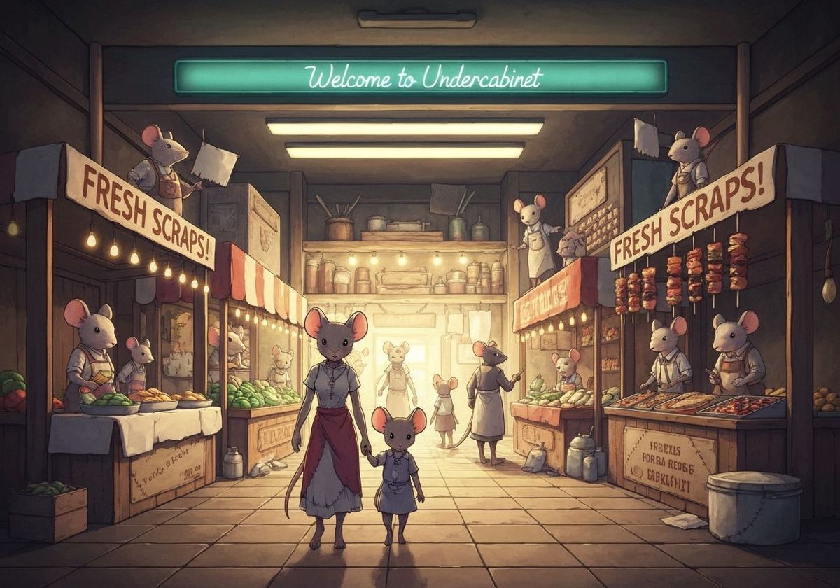 This image shows a vibrant farmers market inside a cabinet, lit by neon signs. Anthropomorphic mice wearing paper outfits work the stalls made of oversized toothpicks, rendered with dynamic motion in a digital art style.