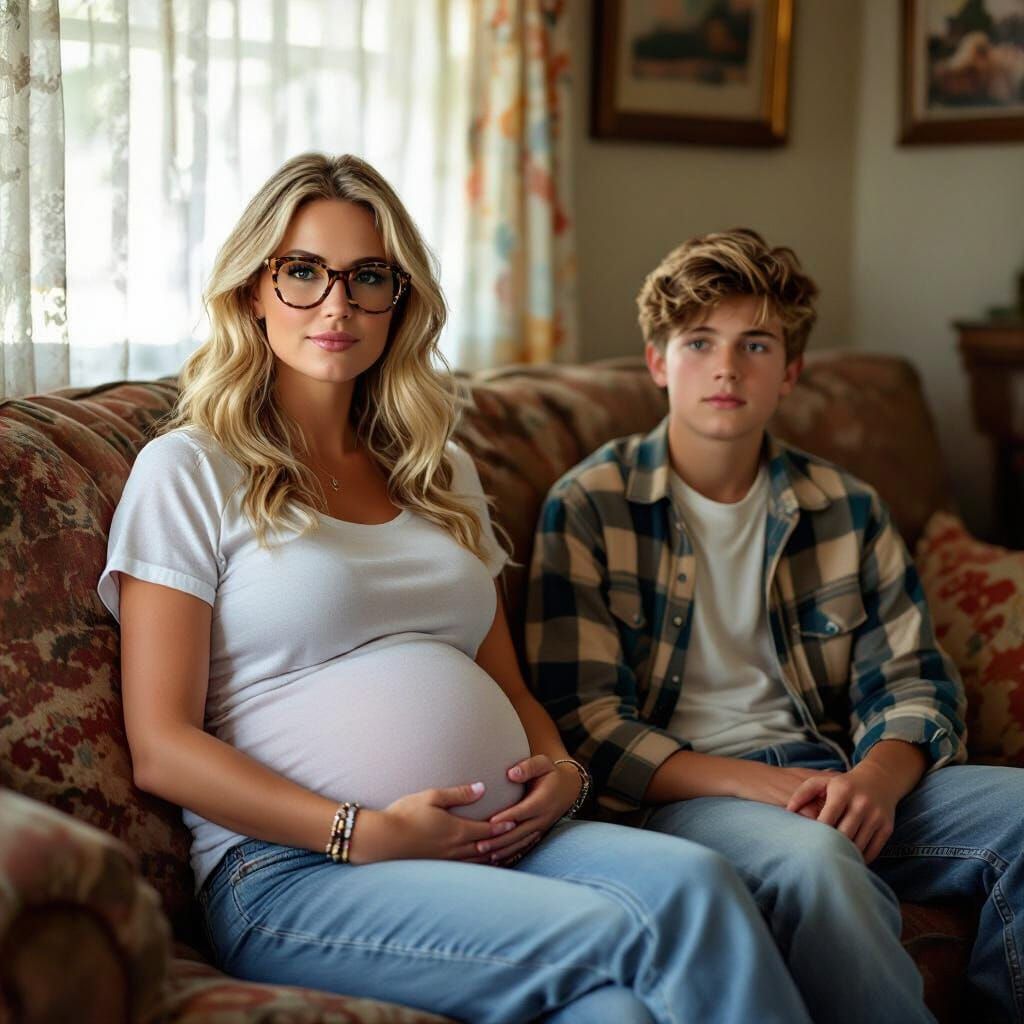 A hyperrealistic image capturing a pregnant woman in 90s fashion sitting with a teenager in a retro rumpus room, featuring detailed textures and lighting.