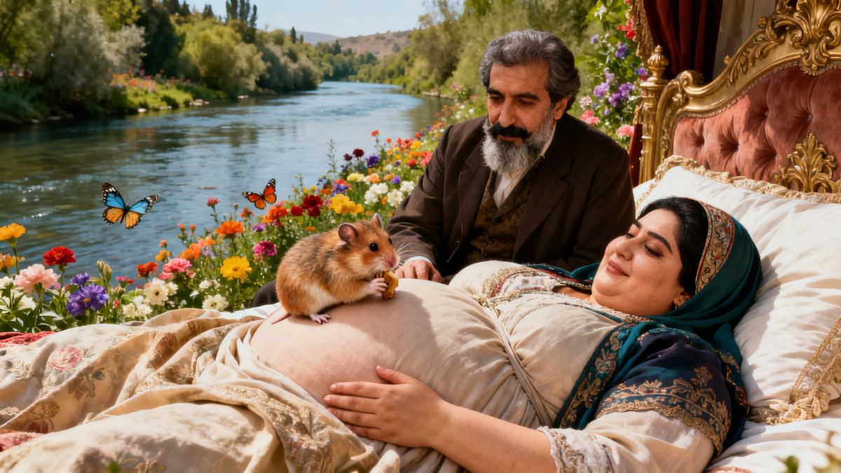 A cinematic film still capturing a scene by a river with flowers and butterflies. A woman rests on a bed while a hamster sits on her belly, watched by a man. Features dramatic lighting and film grain.