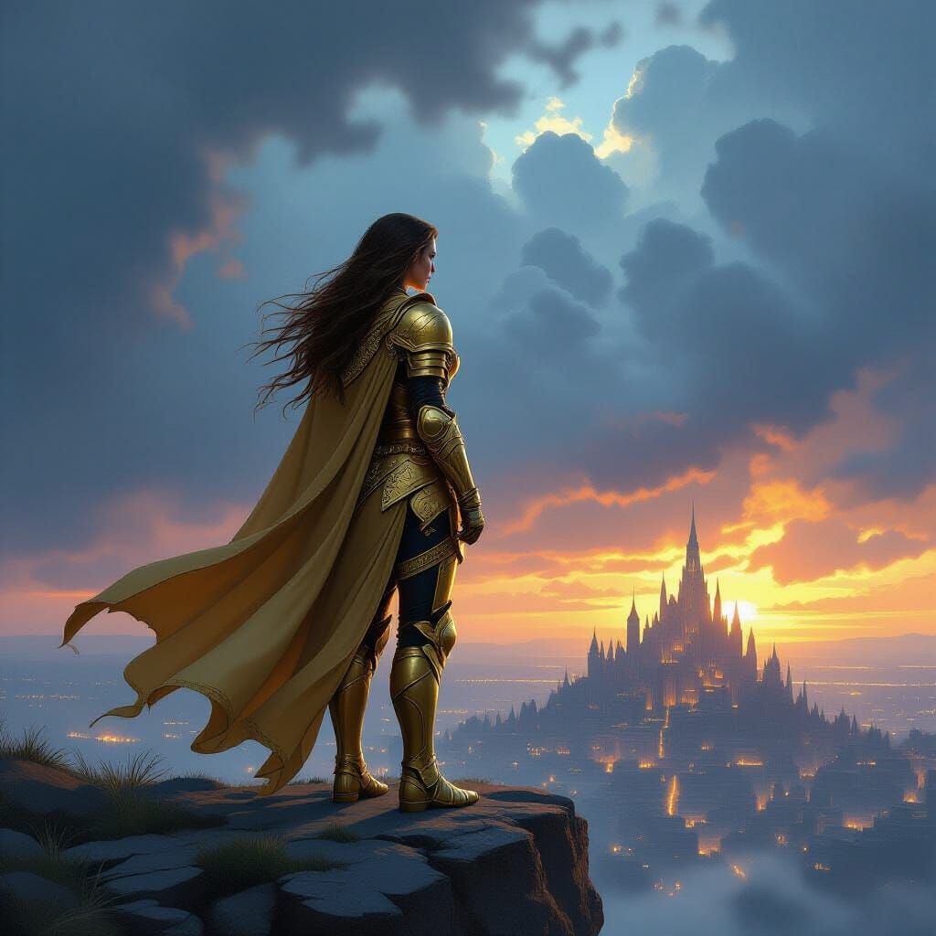 This image shows a knight in golden armor standing on a cliff, watching over a city. The scene is reminiscent of dark fantasy art, with rich colors and intricate details.