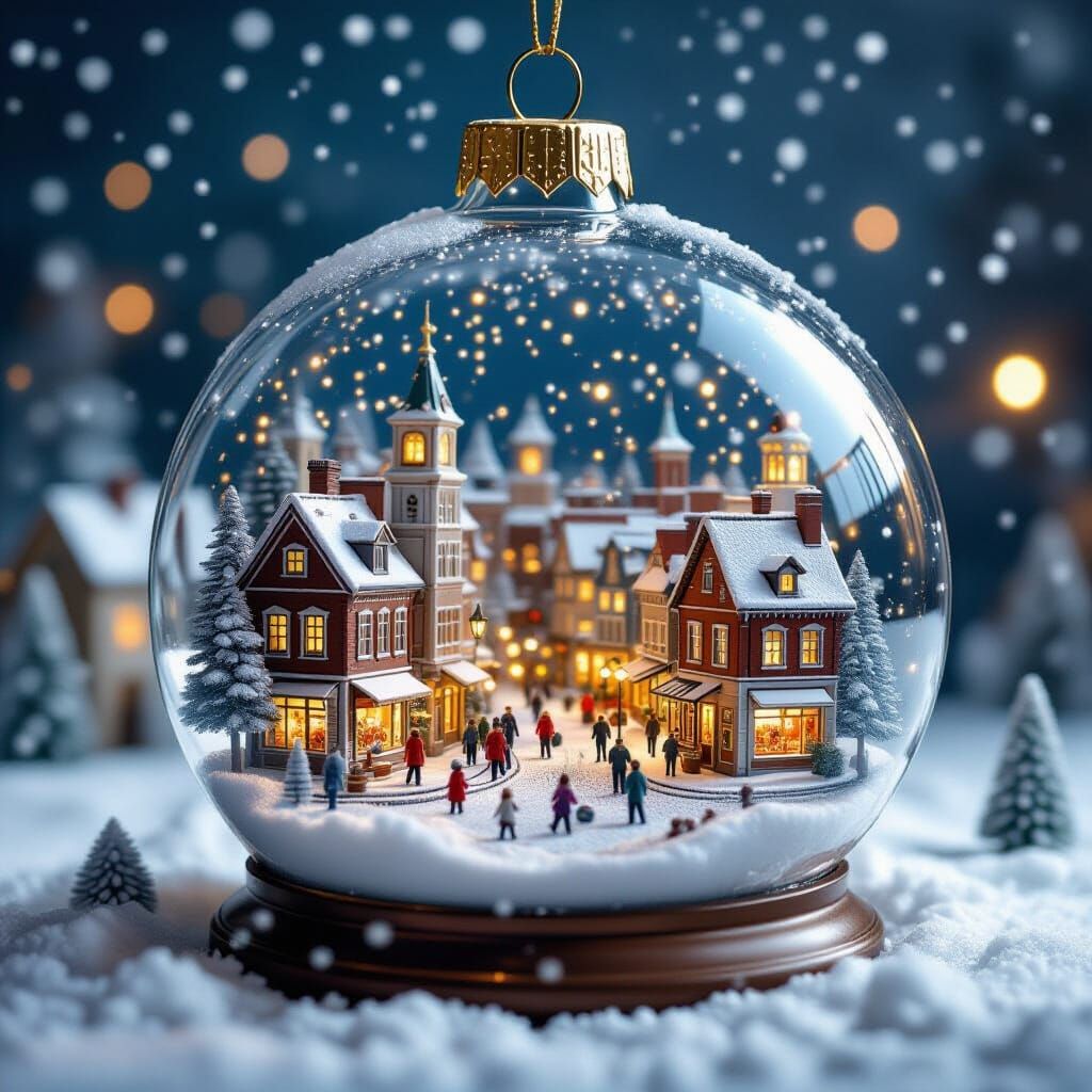 This image shows a detailed miniature city inside a glass Christmas ornament. The tiny buildings and streets are covered in snow, creating a magical winter wonderland, rendered in photorealistic style.