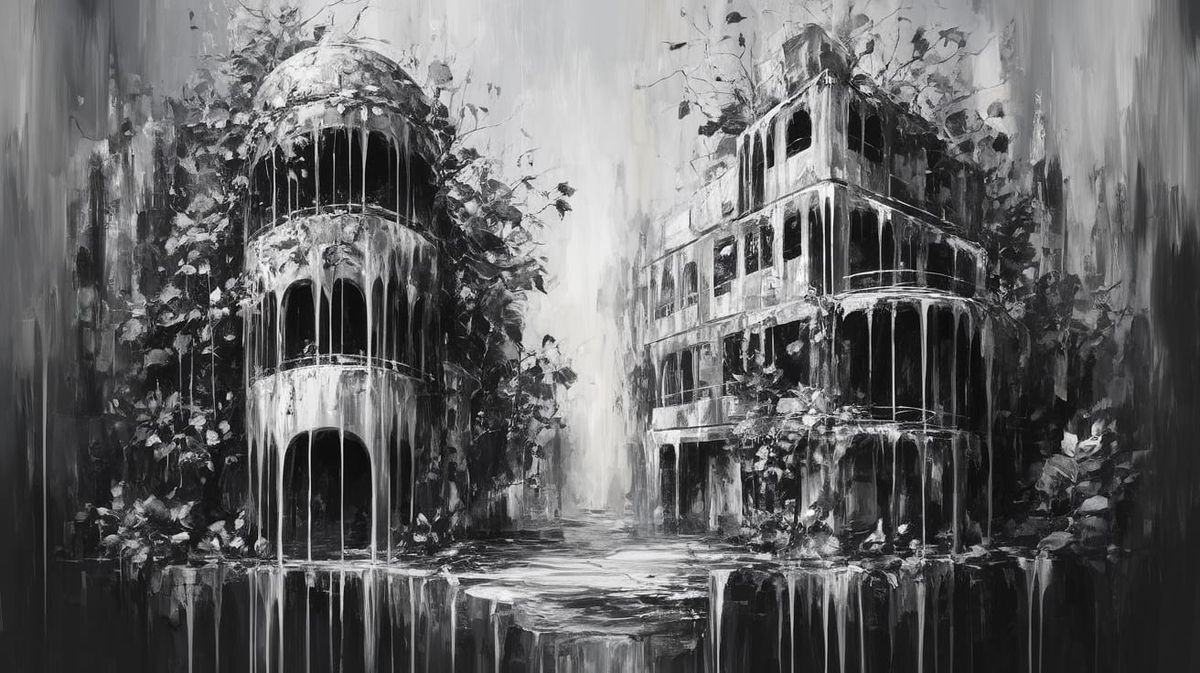 This image shows a surreal cityscape with intertwined, dilapidated structures, blending seamlessly into lush foliage, creating a dreamlike atmosphere of urban decay.
