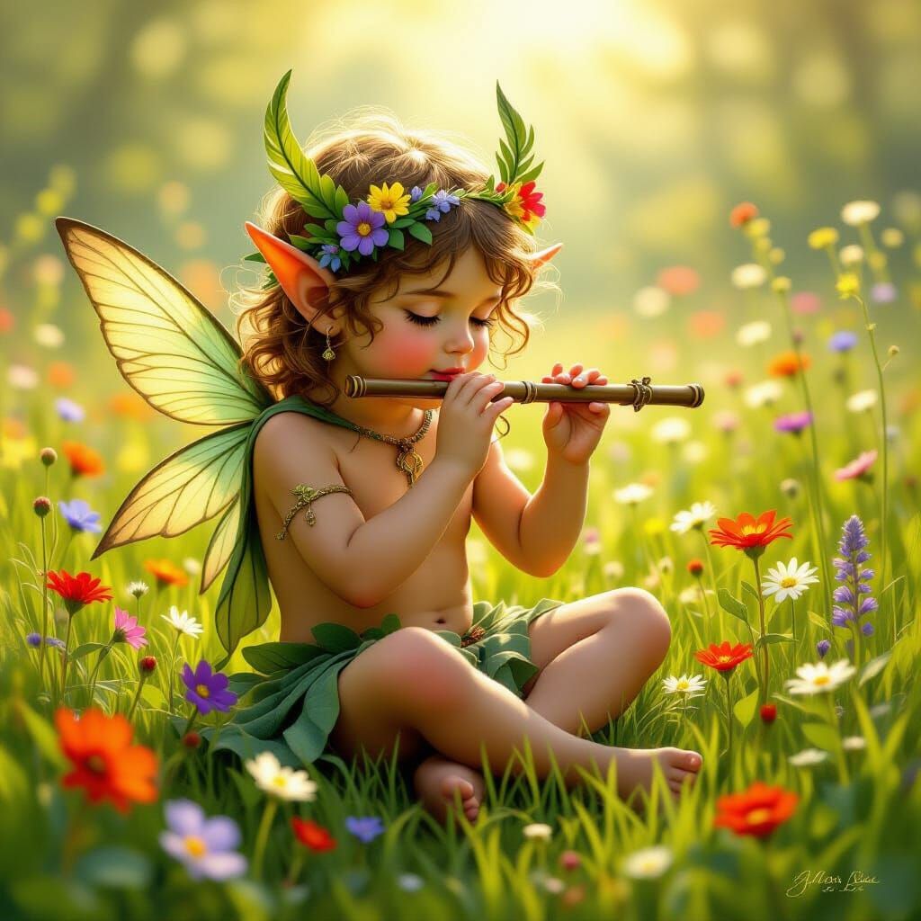 A whimsical depiction of a baby satyr playing a flute in a vibrant meadow filled with flowers, bathed in warm daylight. The artwork evokes fantasy illustration.