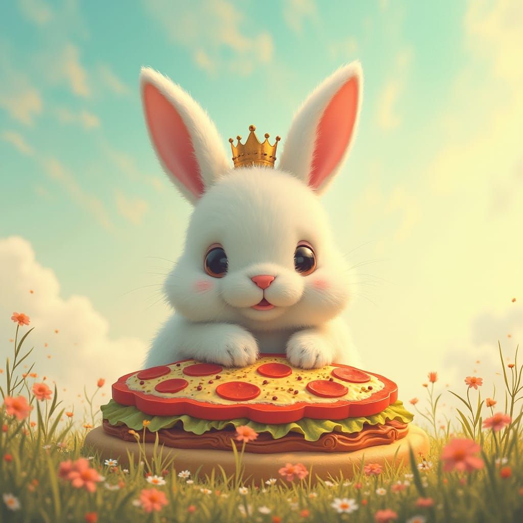 A detailed, whimsical image of a giant fluffy rabbit wearing a crown, sitting on a huge pizza in a pastel-colored meadow. Features subtle ink wash textures and a magical glow.