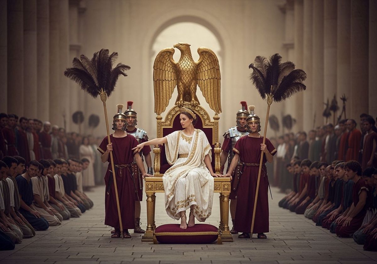 This image depicts a Roman Empress on an eagle-shaped throne carried by soldiers. Servants attend her as peasants kneel. The sharp focus and natural light create a realistic and detailed scene, reminiscent of classical portraiture.