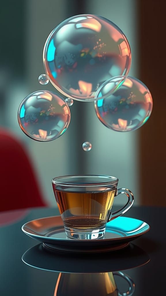 A captivating image showing iridescent, plump bubbles with wide faces floating above a cold coffee on a sleek table. The artwork has a dreamy, ethereal aesthetic.