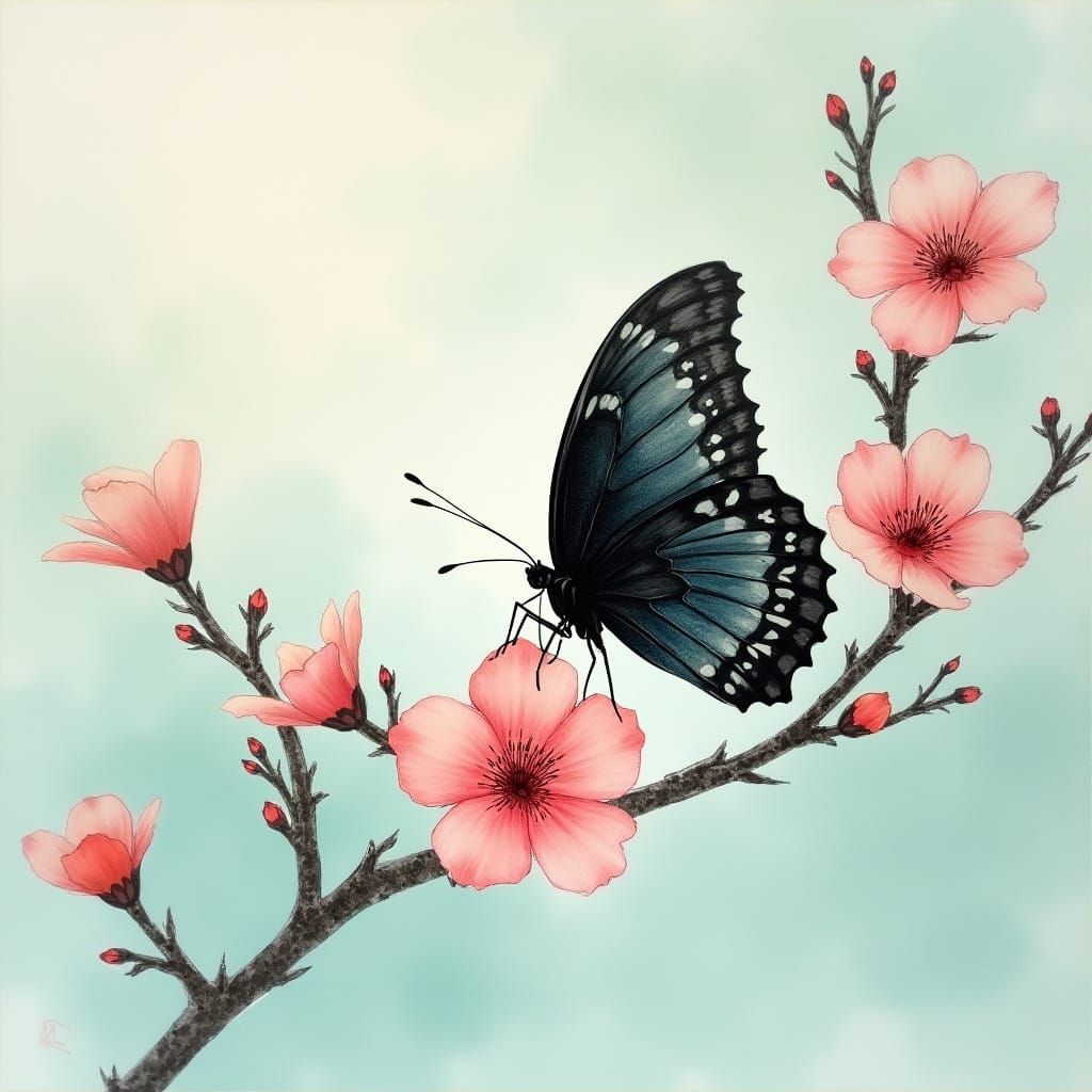 A delicate black butterfly perches on a blooming peach blossom branch, set against a soft, gradient blue-green background, reminiscent of traditional Chinese watercolor prints with subtle texture and gentle brushstrokes.