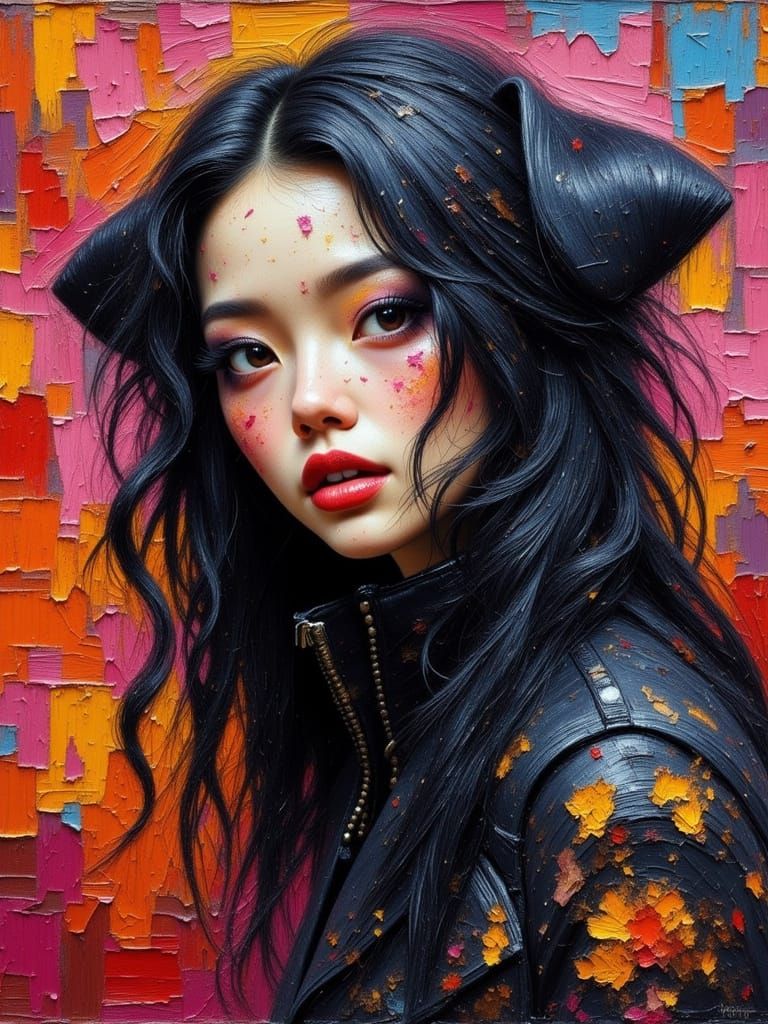This image shows a vibrant portrait of a dark-haired woman with features reminiscent of a black labrador. The artwork employs a neo-impressionist expressionist style, with impasto brushstrokes and thick layers of colorful oil paint.