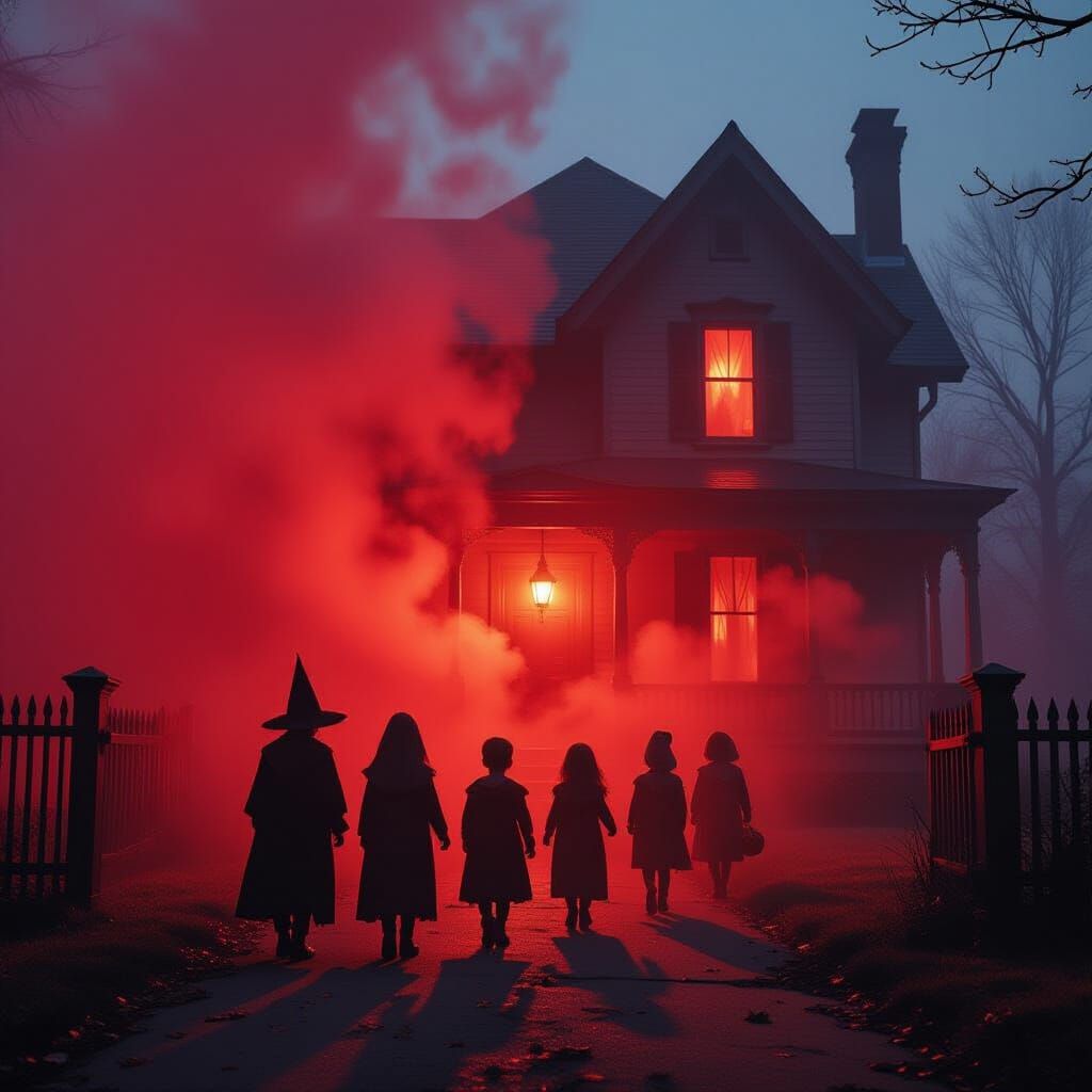 This image shows children in spooky costumes trick-or-treating on a foggy night with red fog and eerie house lights. Rendered in a dramatic gothic art style with vivid contrasts and cinematic lighting.
