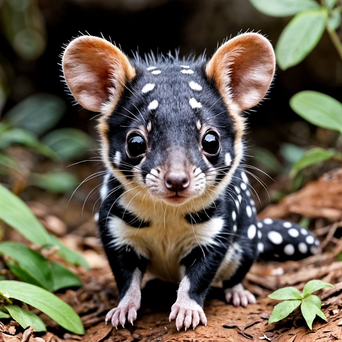 This image shows an adorable baby quoll with a spotted furry coat. The AI has captured the inherent beauty and cuteness of this small marsupial in great detail.