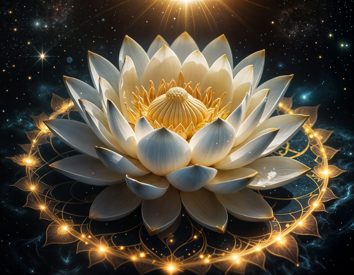 A radiant white lotus flower floats serenely in a dark cosmic void. Golden sacred geometry surrounds it, with beams of light shining from its center, in a mystical fantasy aesthetic.
