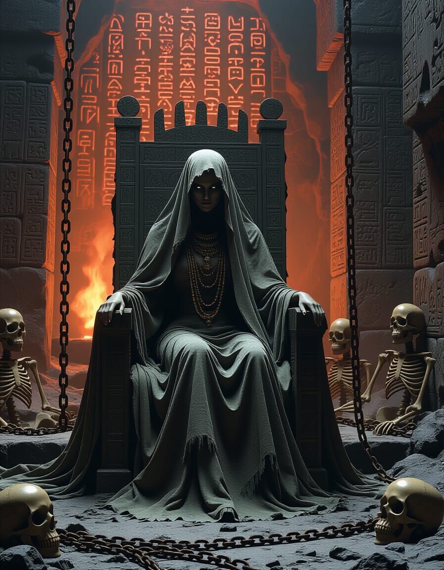 A haunting depiction of Ereshkigal, Sumerian goddess of the underworld, on her throne. The artwork evokes Beksiลski with dark, muted colors and an ominous atmosphere.