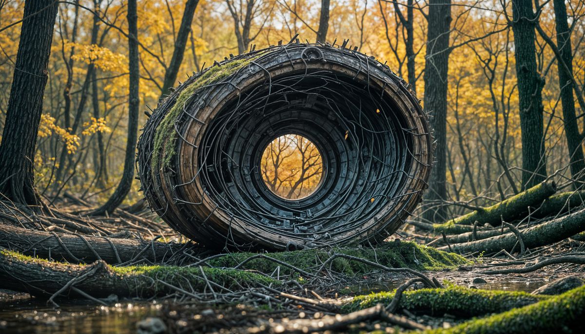 This image shows an artifact floating in an anomaly, reminiscent of the STALKER video games. The background reveals a destroyed, radioactive zone with crooked trees. The image is rendered as professional photography with natural lighting.