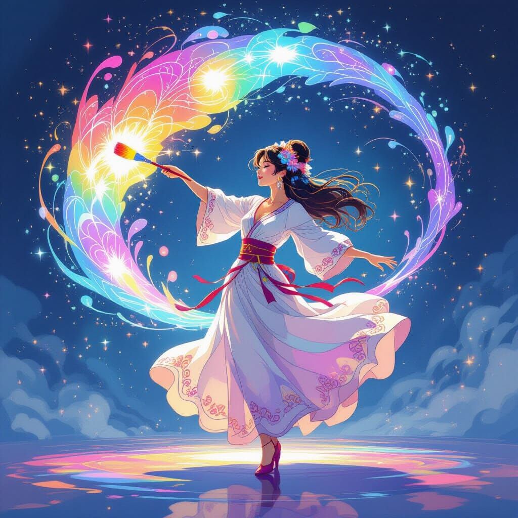 A vibrant illustration of a painter performing a magical dance with a glowing brush, creating colorful, enchanted pictures. Features dynamic lines and ethereal lighting.